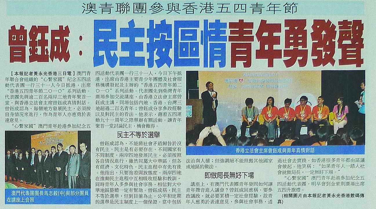 由澳門青年聯合會組織“心繫家國”澳門青年赴港參加紀念五四活動代表團,已於日前順利完成。首先感謝  貴會及  閣下對是次活動所提供協助及支持。另外,是次活動亦得到澳門日報廣泛報導,現附上相關報導,以供查閱。再次衷心感謝!